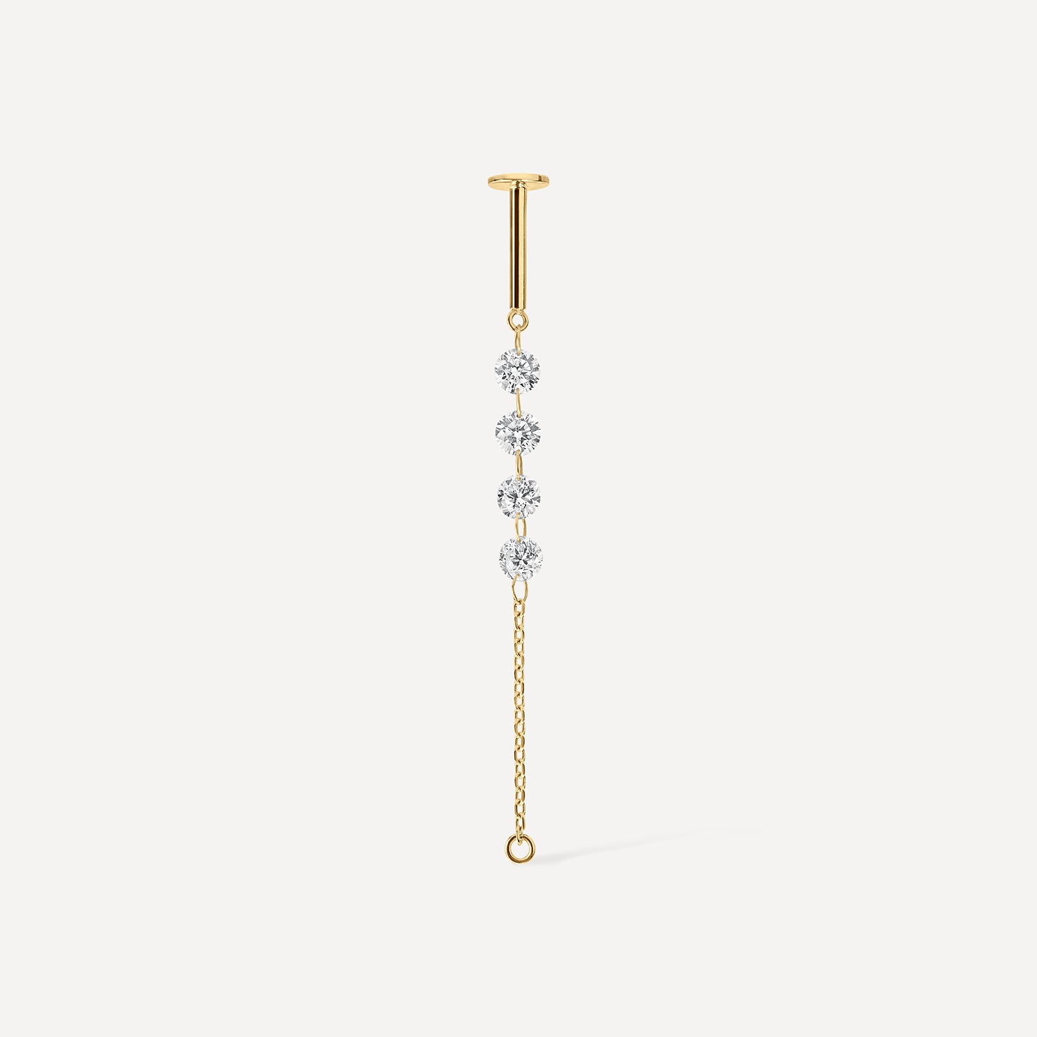 The Floating Diamond Threaded Chain Connector is designed to link piercings on the same ear with subtle movement and refined sparkle. Crafted in solid 14k gold, one end features a flat-back threaded post, while the delicate chain is accented with floating diamond details.