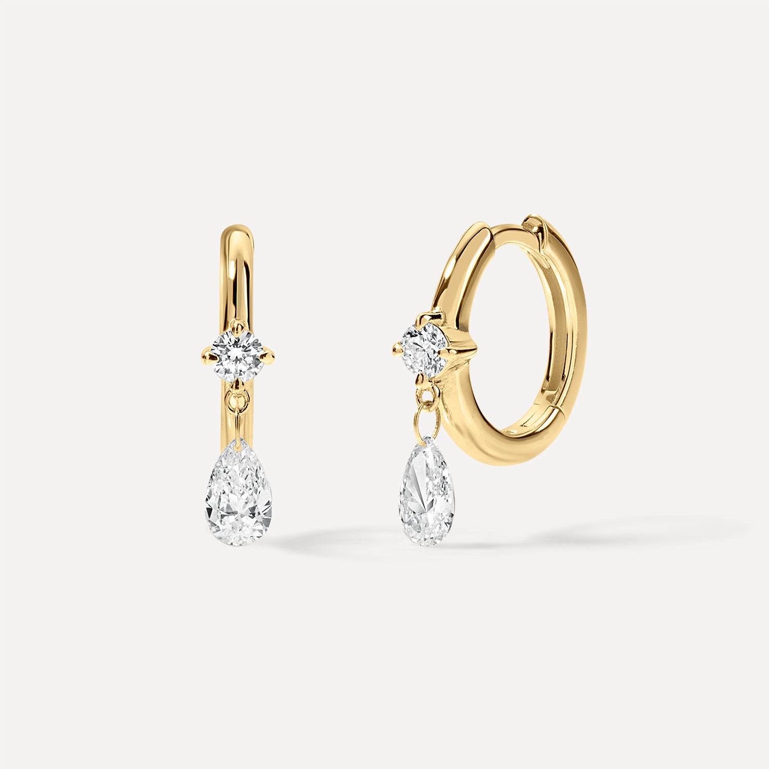 The Round-to-Pear Drop Mini Huggies bring soft movement and dimensional sparkle to any ear stack. Crafted in solid 14k gold, each huggie features a round lab-grown diamond set directly on the hoop, paired with a floating pear-shaped lab-grown diamond that sways gently with every step, for a refined and elegant finish.