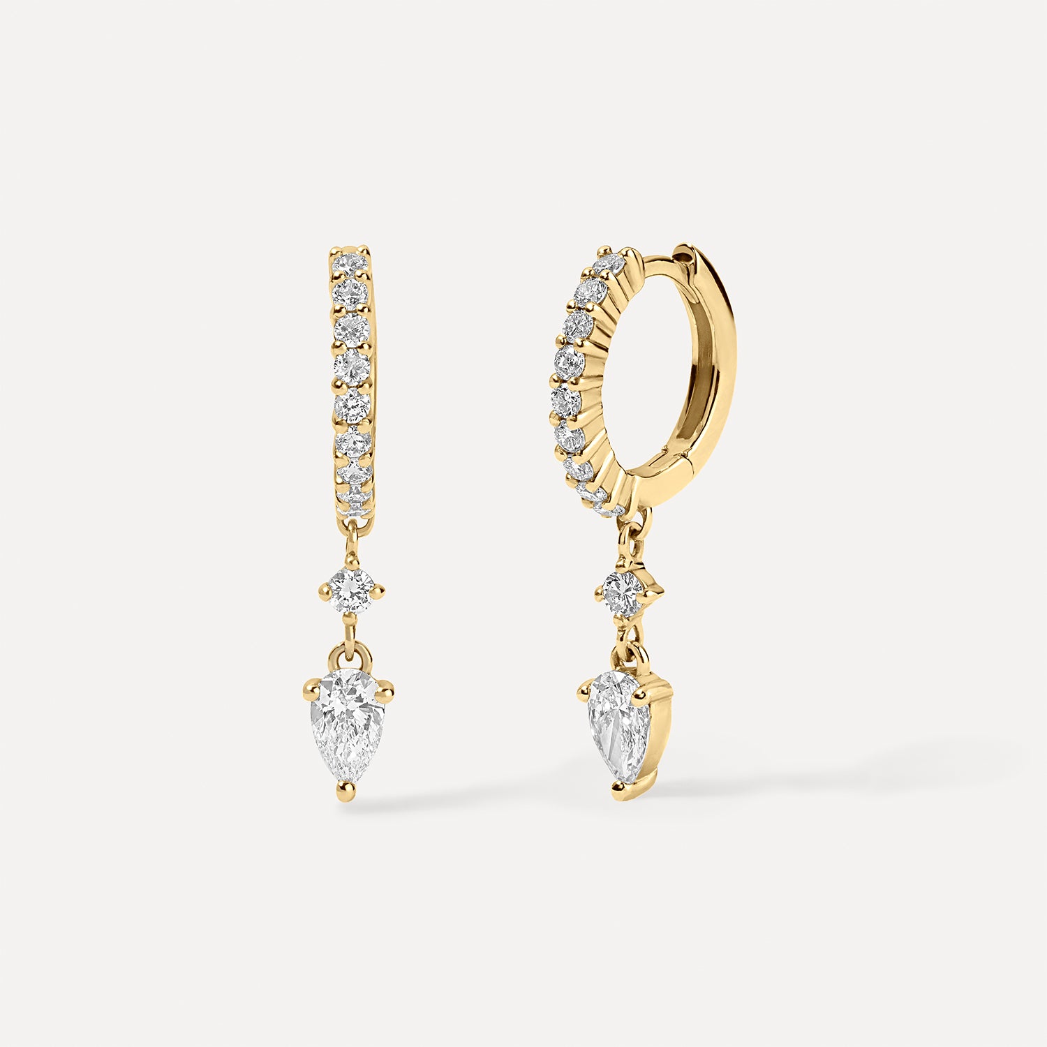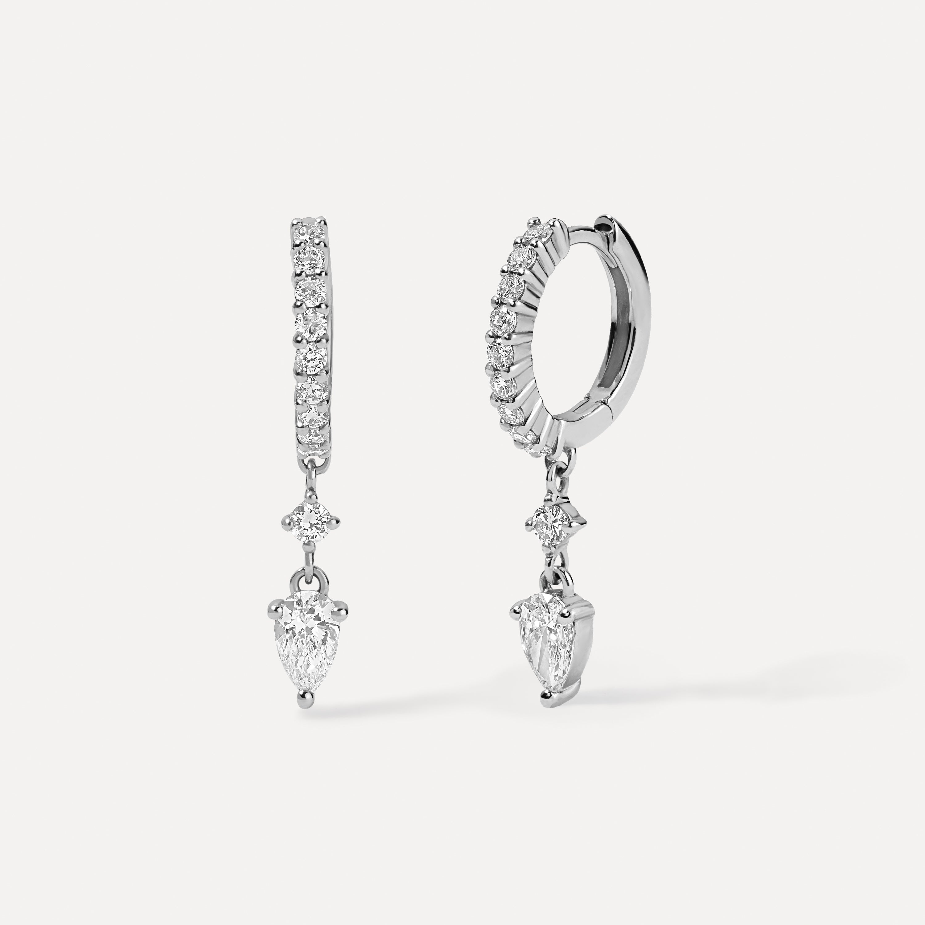 Elegance with a hint of drama. Our Pear Diamond Drop Huggies feature a row of brilliant pavé diamonds along a sleek 14k gold huggie, finished with a floating pear-cut diamond that moves with you. Lightweight, refined, and full of sparkle, they’re the perfect day-to-night statement.